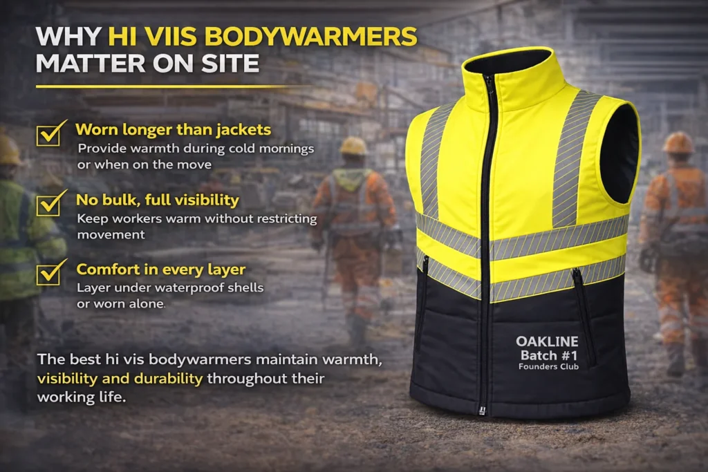 Hi vis bodywarmers are often worn for longer periods than jackets. They are commonly used during cold mornings, layered under waterproof shells or worn alone when mobility is essential.