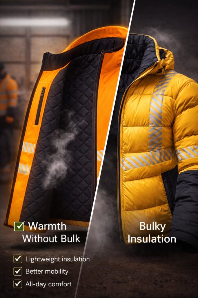 Many workers now prefer lightweight insulated jackets, which retain warmth without making the garment overly bulky.
