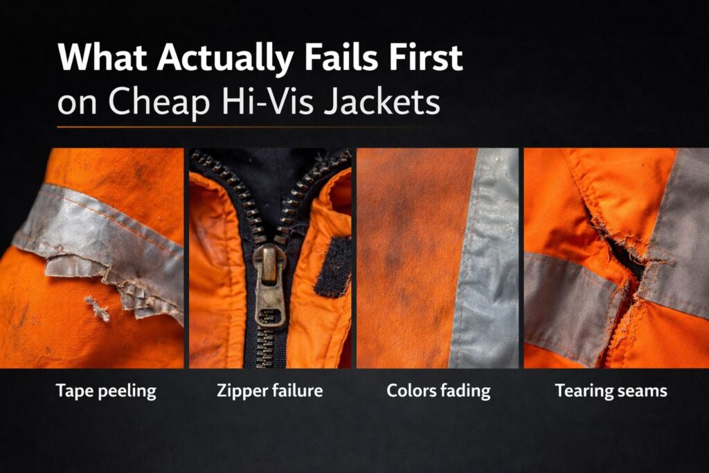 Cheap jackets may meet visibility standards when new but often deteriorate faster under real working conditions.